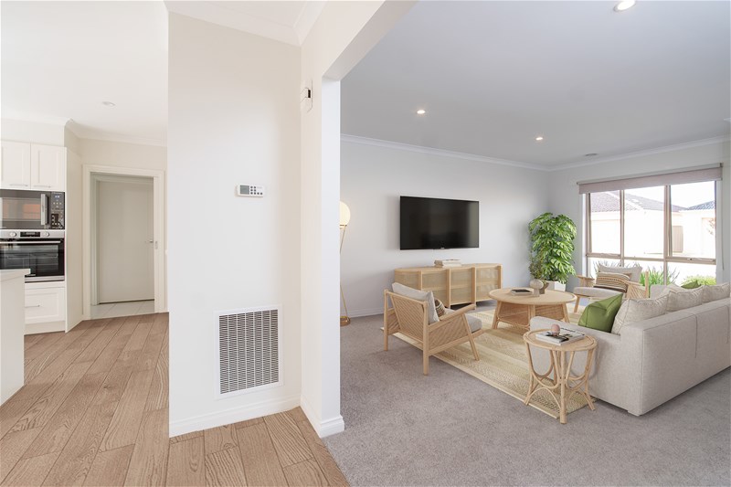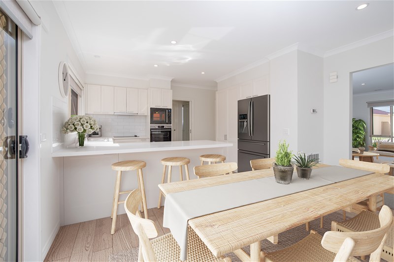 At the heart of the home is a light-filled living space that flows seamlessly into the dining area and beautifully appointed kitchen. Finished with a modern and stylish colour palette, the kitchen features quality appliances and plenty of room to cook, entertain, and enjoy daily life.
