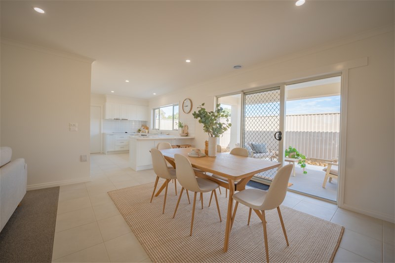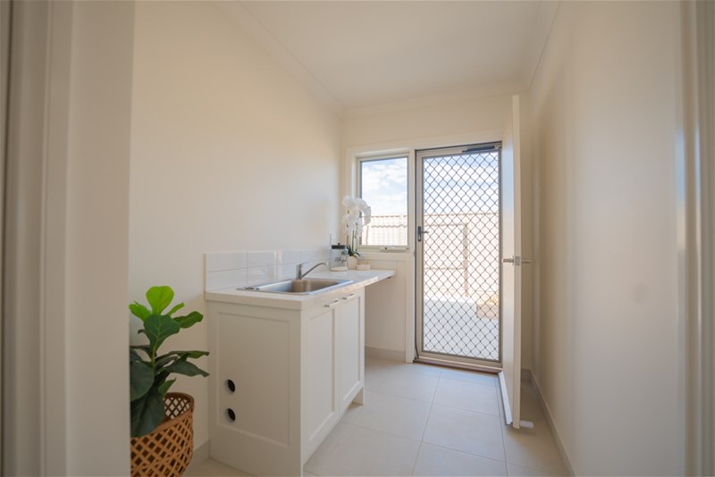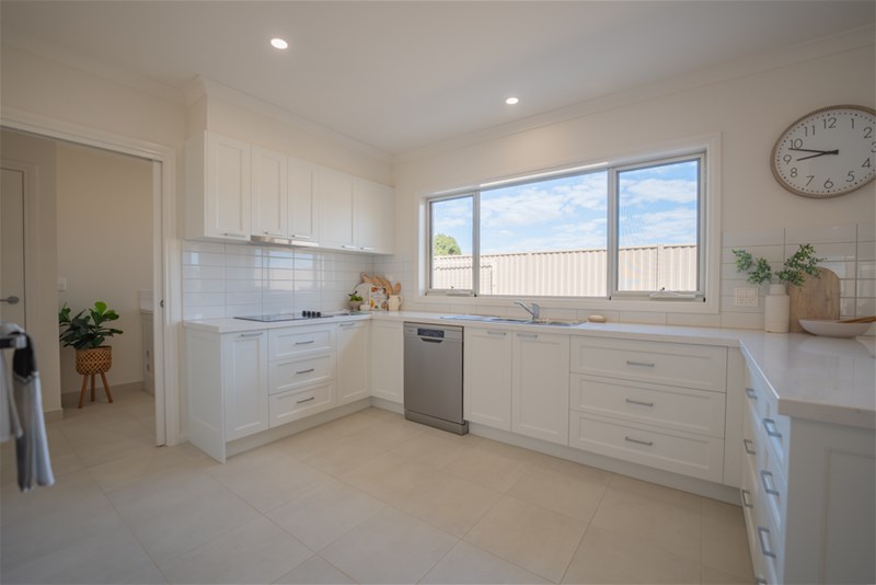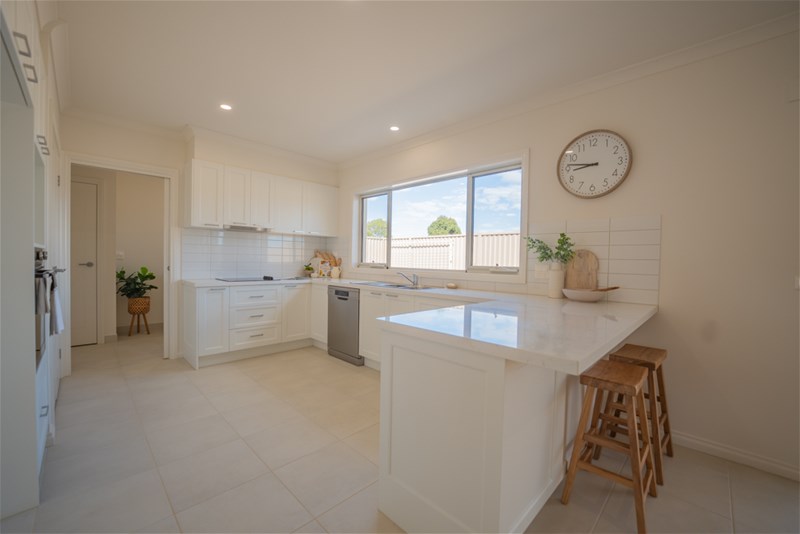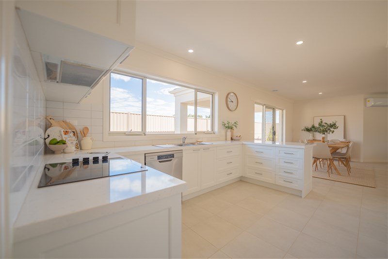 The light-filled open-plan living and dining area flows effortlessly to a covered Alfresco, offering the perfect space to relax and opportunity to enjoy the stunning lake views and vibrant sunsets. The contemporary kitchen features premium stone benchtops, ample storage, and quality appliances, all set within a stylish, neutral colour palette.